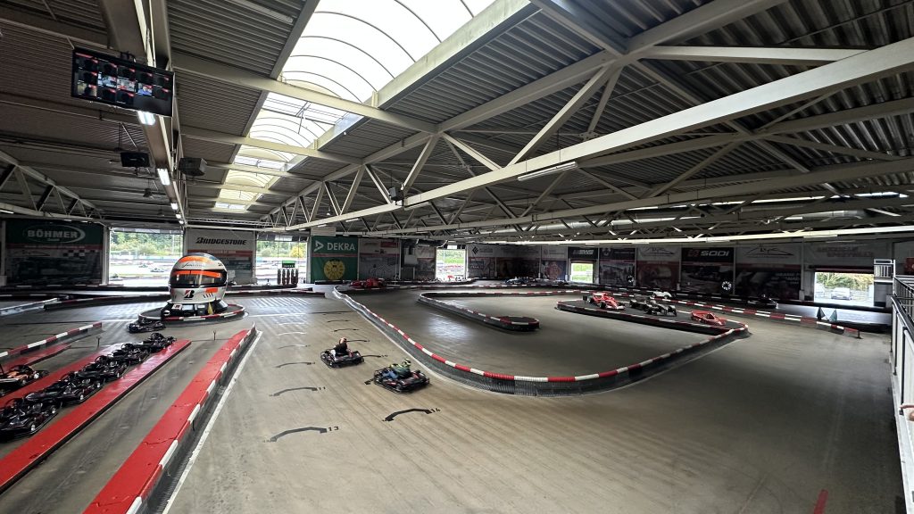 Unsere freitragende Indoor-Halle bietet maximale Sicherheit und freie Sicht auf das gesamte Renngeschehen – ohne störende Stützen, dafür mit voller Konzentration auf die Ideallinie.